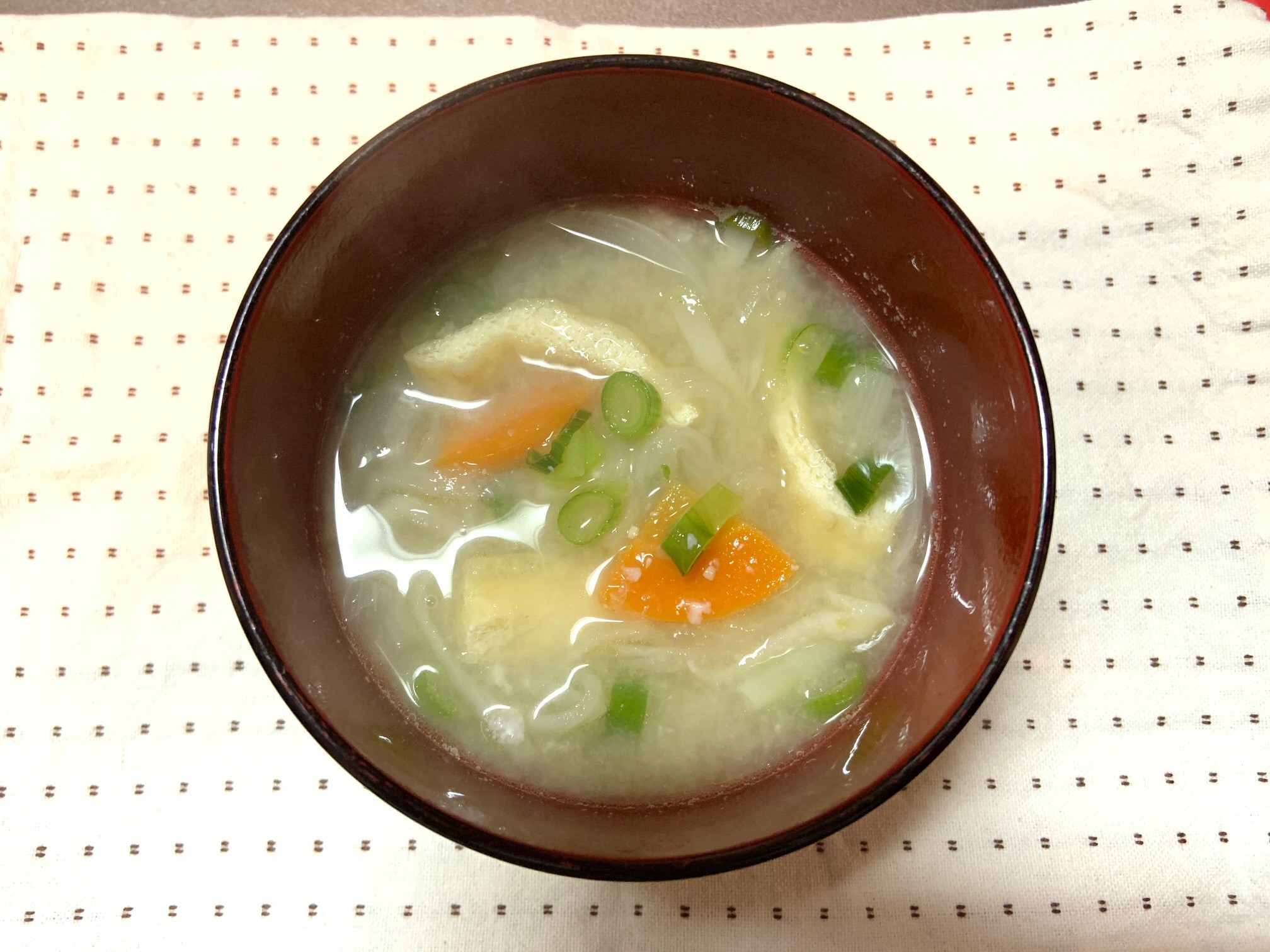 切干大根20g(もどした後約80g)にんじん40g 玉ねぎ80g 油揚げ20g 青み野菜少々