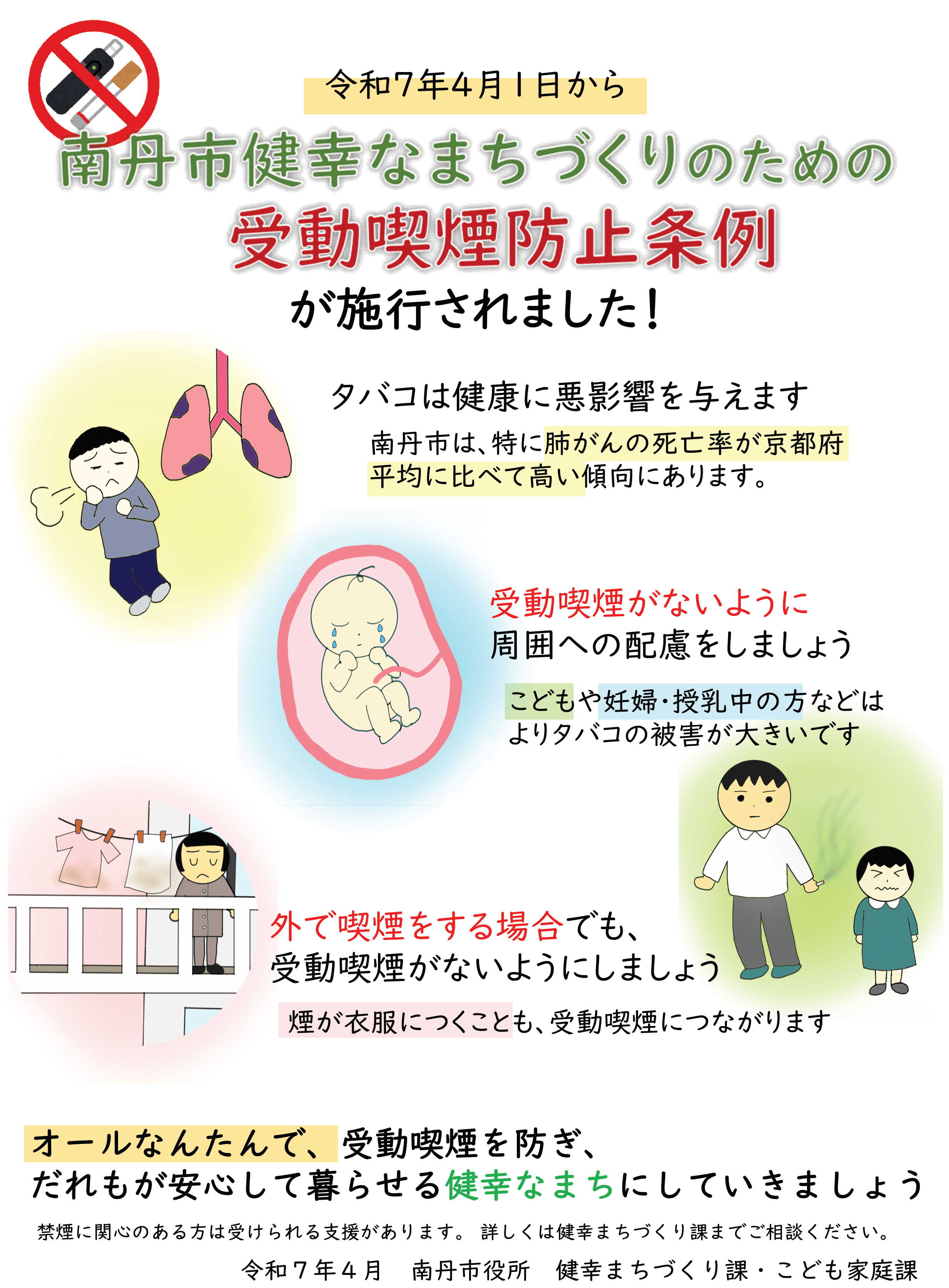 令和7年4月1日より「南丹市健幸なまちづくりのための受動喫煙防止条例」を施行し、吸う人、吸わない人の権利を尊重し、受動喫煙のない健幸なまちづくりを推進します。みなさまのご理解ご協力をお願いします。