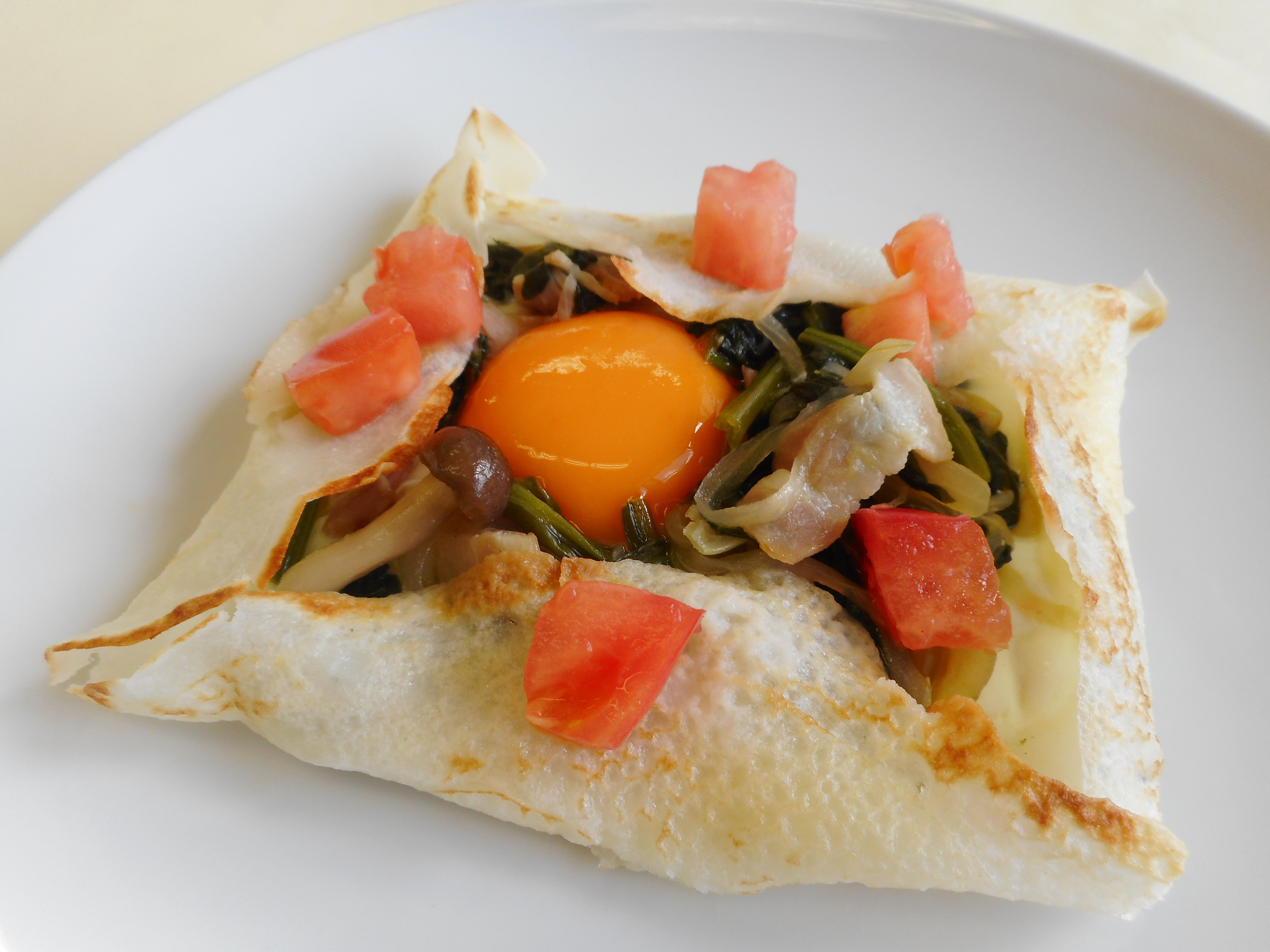 - 卵が半熟になったら③を入れて四方を折りたたみ、角切りにしたトマトを散らしてできあがり。
